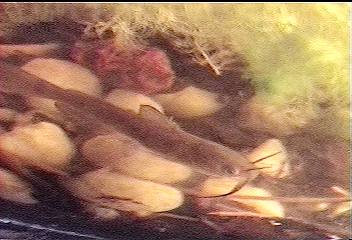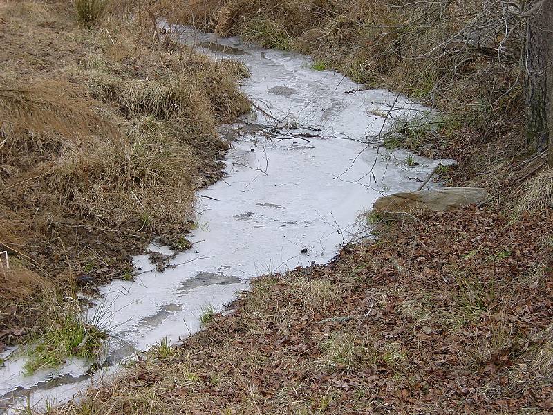 On Thursday (1-18-01) I had a little free time and decided to check some wetlands for signs of salamanders. We have had about a week with temperatures staying above freezing; yesterday the temperature rose to near 60oF. I did not find anything but insects in any of the vernal pools. In a partially isolated pond (the one shown frozen in the linked picture above) I used a dip net to search the grass and debris hanging in the water on the sides of the pond. I netted a Red-Spotted Newt. There are a good population of newts living in this pond and I can usually find one when I wish. I also netted several very small catfish, probably fingerling Bullheads. I need to get a fish field guide.