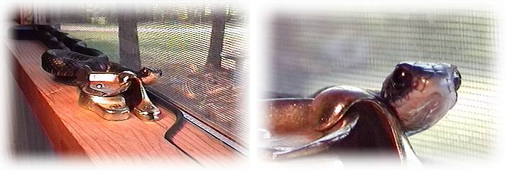 On Sunday (05-20-01) I hosted Sunday dinner for my family...shrimp and grits. Hope, Win's fiancee, had caught a beautiful Black Rat Snake while taking a walk earlier in the week. The snake was about 3.5 feet in length and was the largest snake she has caught thus far. She brought it over and after lunch I made pictures. Win had set out some cover items (metal trash can lids) beside the farm pond last week. He and Hope are giving a talk to a group about water snakes in June, so he was hoping to attract a Redbelly to catch as a display specimen. Checking them, he did not find any snakes but did find an Eastern Narrowmouth Toad.