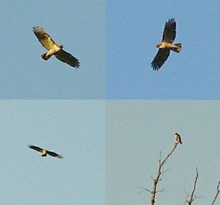 Tuesday (05-15-01) I got home early from work. A Redtailed Hawk routinely sits in the top of a dead White Oak tree at the top of the pasture above my home. It was there as usual. I took the camera and head up the road towards it. As usual the hawk registered its dissatisfaction with my actions by screeching loudly as I left the yard. However, it did not fly away as usual. I got close enough to start taking pictures with the digital camera. It left the tree, but instead of flying off to a distant perch, it soared in circles. After first it was pretty far off, but then it became bolder and closer. All the while it screeched in compliant. I was able to snap a couple pictures using the highest pixel density. Unfortunately, I ran out of memory and was not able to snap a picture at its closest approach. Admitting defeat, I retreated to home and the hawk resumed its perch. Later, I road cruised locally after dark. I found an AOR baby Southern Copperhead. Later I found an AOR young Eastern Garter Snake.