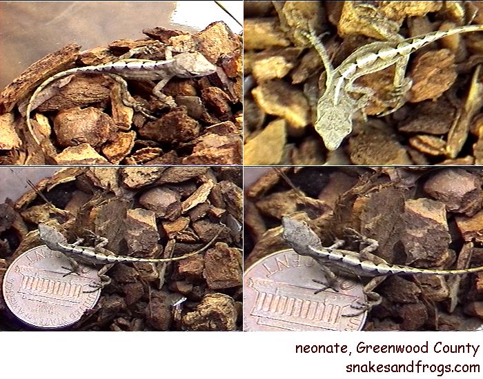 Last Sunday evening, Win's fiancee, Hope, found a very tiny, newborn Anole lizard. It is very unusually patterned. He gave me a call and said he had found what look like a Brown Anole. It was found in Greenwood County (Piedmont, SC). The Brown Anole is a species from West Indies' which was introduced to Florida and is now abundant there. I had not heard of any being in South Carolina. I figured it was just a neonate Green Anole. Upon seeing it , I now believe it is a Brown Anole. It has not made a color change since being caught (Brown Anoles do not change color.) I have never seen an Anole as small as this one. Do Green Anoles have such patterning when first born? If anyone can confirm the species of this Anole, please let me know.