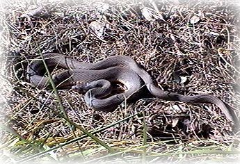 Tuesday (7-3-01), Another Ratsnake was in a tree on campus, located by the bird calls, but again too high to catch. We had to go off campus, and made a stop at a place I know. We turned a big piece of fabric/carpet of some sort, and found underneath a Black Racer (got away) and a Black Ratsnake. The ratsnake was loaded with a recent meal and we gently let it go into the bushes. For the evening drive, we had rains, and I found a Midland Watersnake and Black Ratsnake, AOR.