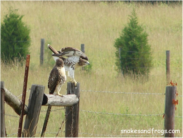 The hawk turned out to be two juvenile Red-tailed Hawks. Win locked the chickens in the coop. The two juvenile delinquents sat on the fence