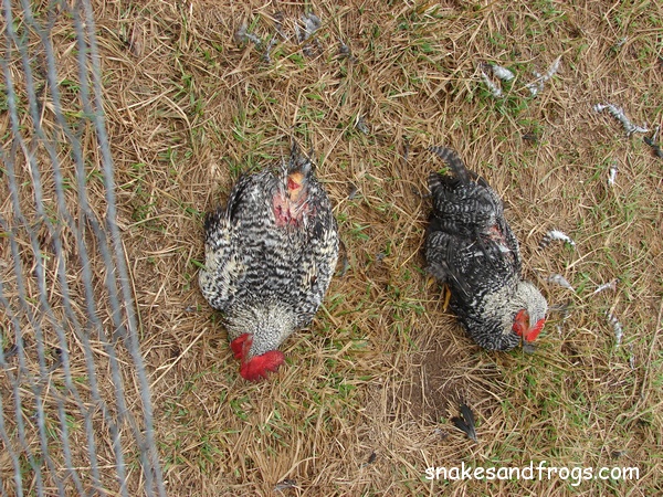 just before dark the evening before. Our first theory was that a lightening strike had killed or wounded the chickens and
