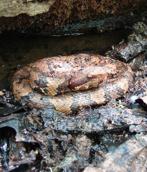 Before leaving the reservoir area, Win searched a nearby wetland. Beside a log, he found a juvenile Cottonmouth.