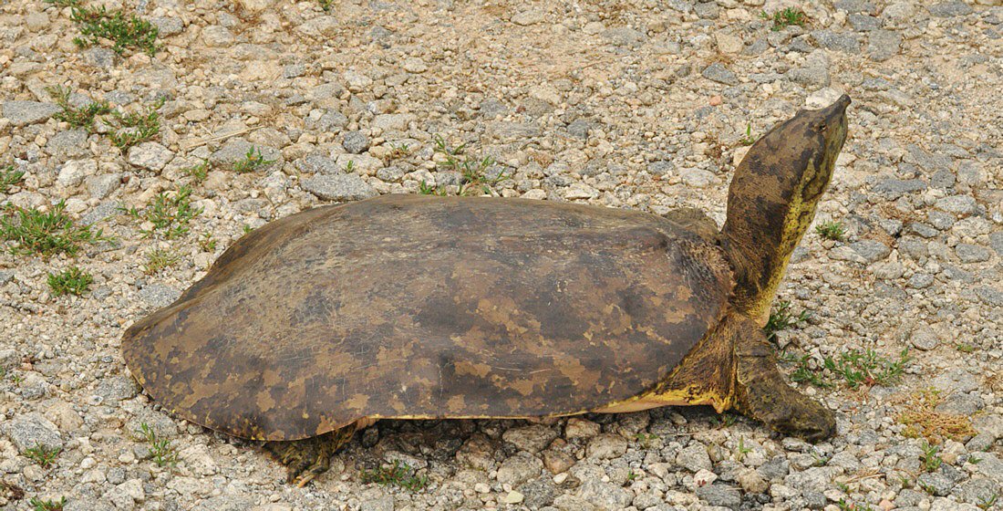 Late one afternoon on my way home, I spied a large female Gulf-coast Spiny Softshell Turtle on a bridge. She had made
