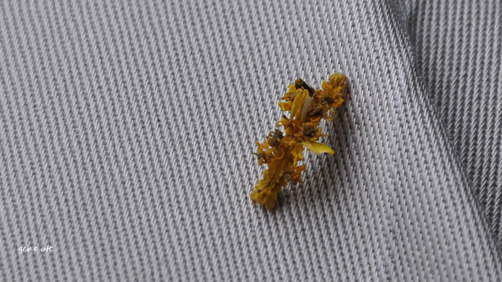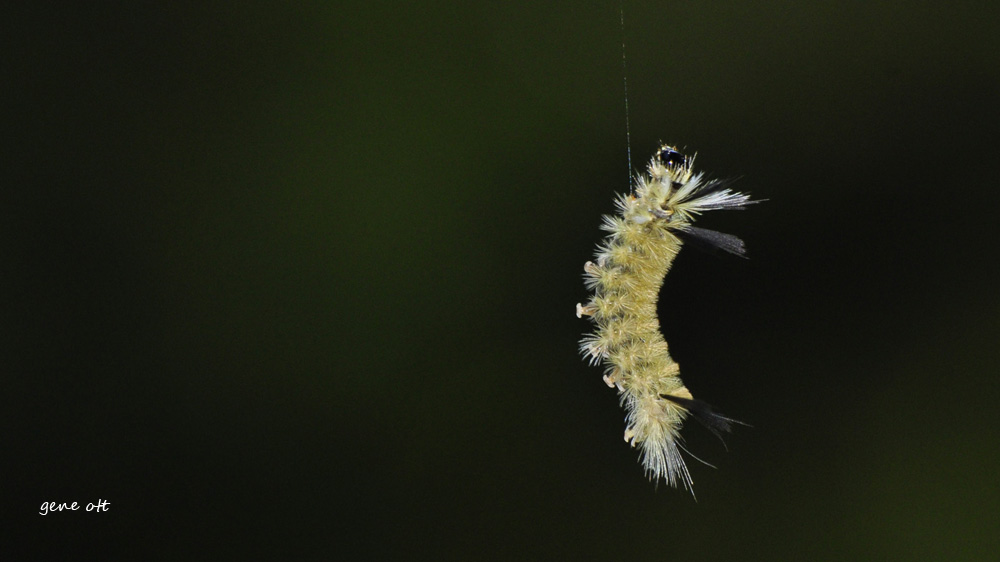 I came upon an interesting, bristly caterpillar hanging from its silk. My best effort at identification is the American Dagger Moth. I found a very small caterpillar that seemed to be dressed in a camouflage using pieces of flower parts. I believe this caterpillar belongs to the genus Synchlora.