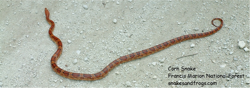 Win, my son, and Paul, Win's brother-in-law, and I left our homes in the Piedmont of South Carolina at mid-morning on Friday, May 06, 2005. Our destination was Hellhole Bay National Wilderness Area located near the coast in the expansive Francis Marion National Forest in Berkeley County, SC. Win and his wife, Hope, were expecting their first child at the end of the month. Paul and his wife were also expecting their second child a month or so later. We drove down in two vehicles in case a quick return trip was needed. Temperatures throughout the state had dropped recently and the morning was cloudy. We hoped things were warmer at the swamp. We arrived at the Holiday Inn Express in Moncks Corner. The Inn was the designated location for all attendees who are not tough enough to campout in the Forest. We fit into this category, so we checked into our rooms. We did not see any other attendees, so we decided to head to the swamp for some early searching. At the swamp, some sunshine broke through and temperatures reached almost 60 F. We checked the camping area that would serve as the rallying point during the event, but no one else had arrived. Conditions were not very encouraging for finding reptiles moving about. It would be good conditions to find snakes under artificial cover, such as old metal roofing and boards, but we did not know of any in the area. So we drove around some of the forest's roads. Temperatures fell somewhat as the skies clouded over again. We were discouraged and heading to the back to camp area when Win shouted for me to stop the van. I had driven right past a Corn Snake! |