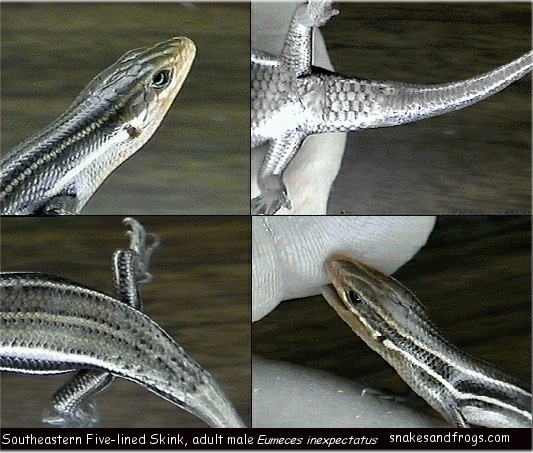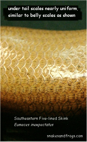 These similar species can be positively identified by examining their scalation. The Southeastern Five-lined Skink can be differentiated from the Five-lined and Broadhead Skinks by the undertail scales. The Southeastern Five-lined Skink has scales of approximately the same size, while the Five-lined and Broadhead Skinks have a row of broader scales down the middle of the tail. The Five-lined Skink can be differentiated from the Broadhead Skink by the scales on the face. The Five-lined Skink has 4 labials and 2 enlarged postlabials, while the Broadhead Skink has 5 labials and no enlarged postlabials |