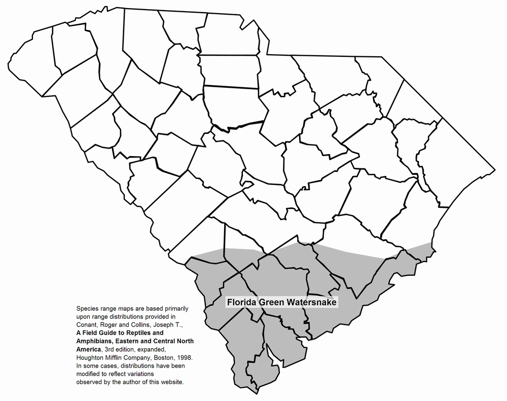 The Florida Green Water Snake can be distinguished from other large watersnake species in South Carolina by the ring of small scales which surround the eye.